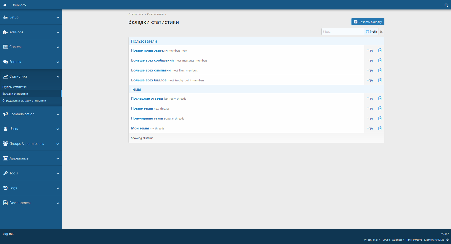 Стандартные вкладки статистики являются отдельным дополнением.